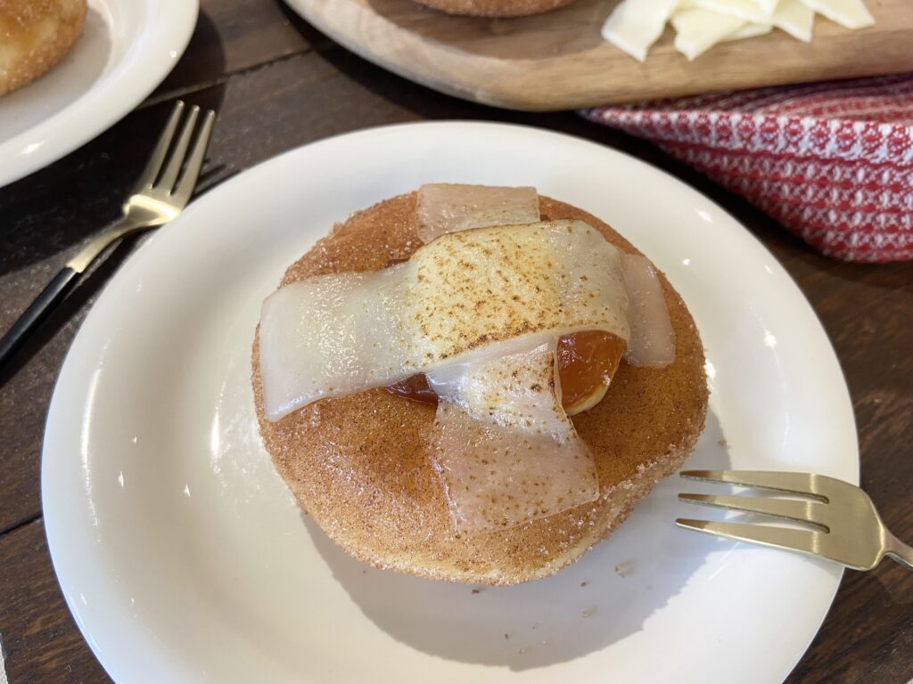 「クリスピー・クリーム・プレミアム シナモンアップルパイ with モントレージャックチーズ」を実際に食べてみた感想ですが、ドーナツということを一瞬忘れてしまうほど、アップルパイ感が強い! チーズを炙る工程を取り入れられていることで、香ばしさがさらにアップしていて、キャラメルアップルの香りがより引き立っているように感じます。