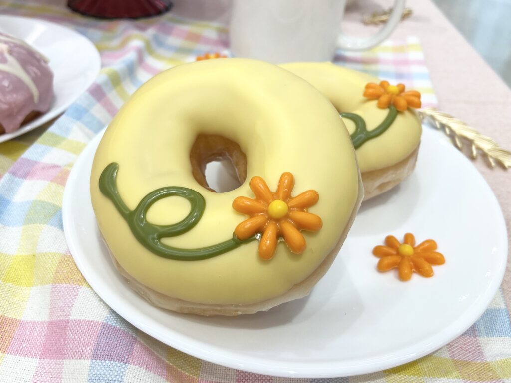 「フラワーカスタード」は、カスタード風味でコーティングしたリングドーナツに、オレンジ色の小さな花が描かれている、見た目からハッピーになれるドーナツ。茎は抹茶味で、味のアクセントになっています。