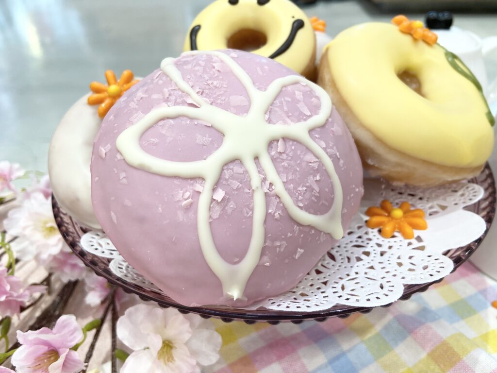 「サクラクリーム」は、桜をモチーフにしたピンクのチョコをちりばめた桜色のシェルに、ミルキーなホワイトチョコのラインで桜の花が描かれたドーナツ。