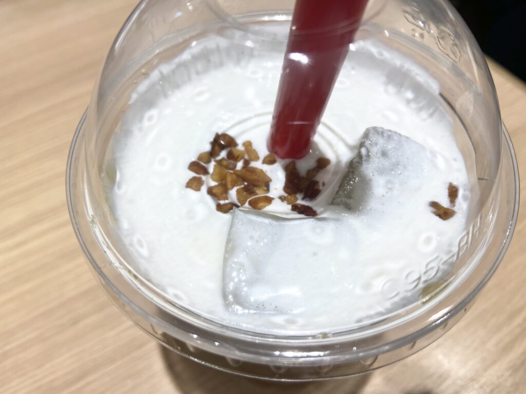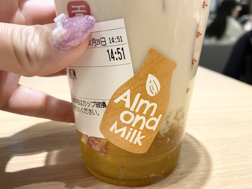 贅沢なハニーの甘さがたっぷりのドリンクですが、ウーロンティーのまろやかな口あたりと合わさり、すっきりとした後味で甘さは後に残りません。アーモンドミルクティーはミルクティーよりさらにあっさりしたのどごしだと感じました。