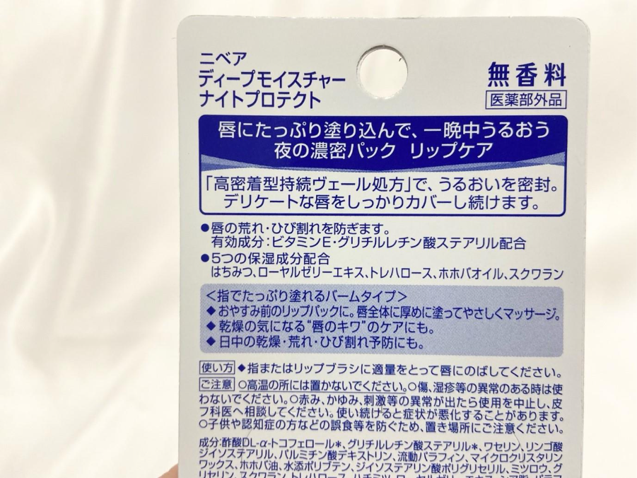 「ニベア ディープモイスチャー ナイトプロテクト」は、唇にたっぷり塗り込んで、一晩中うるおう夜の濃密パックリップケア。無香料タイプとはちみつの香りがあるのですが、筆者は無香料タイプを愛用中。