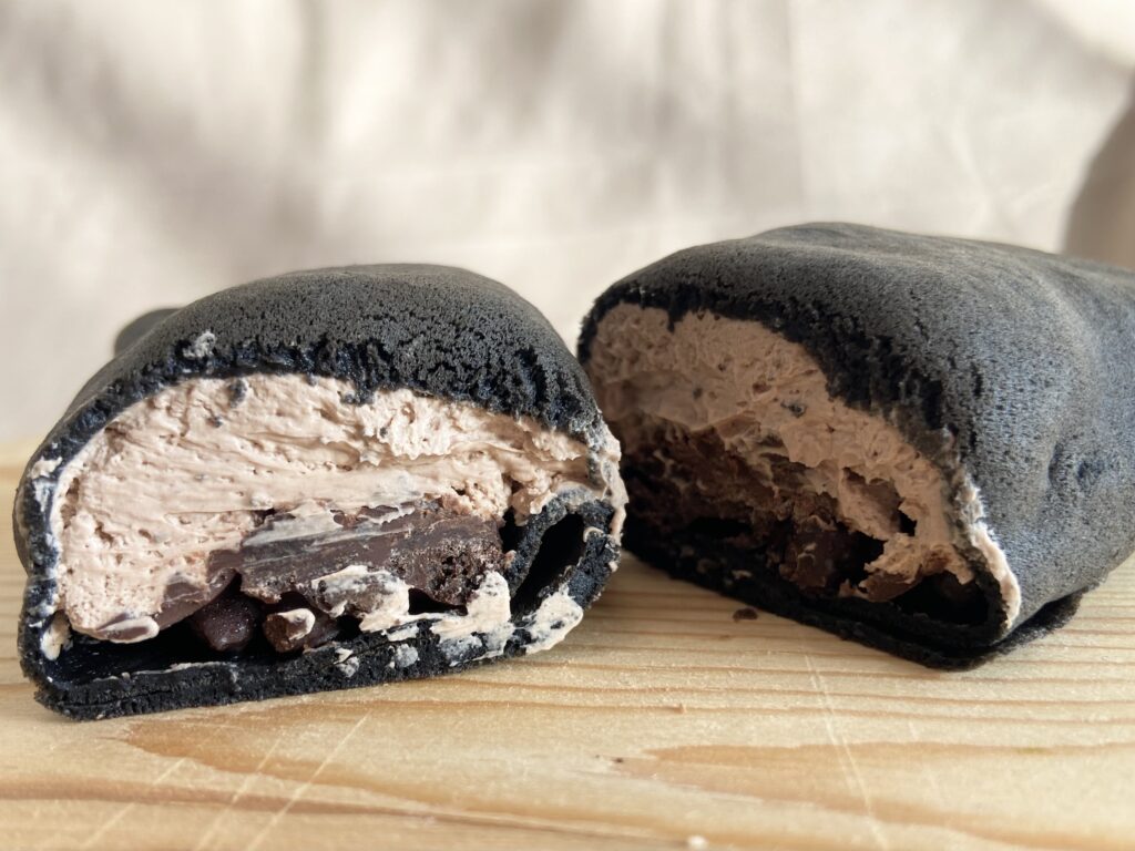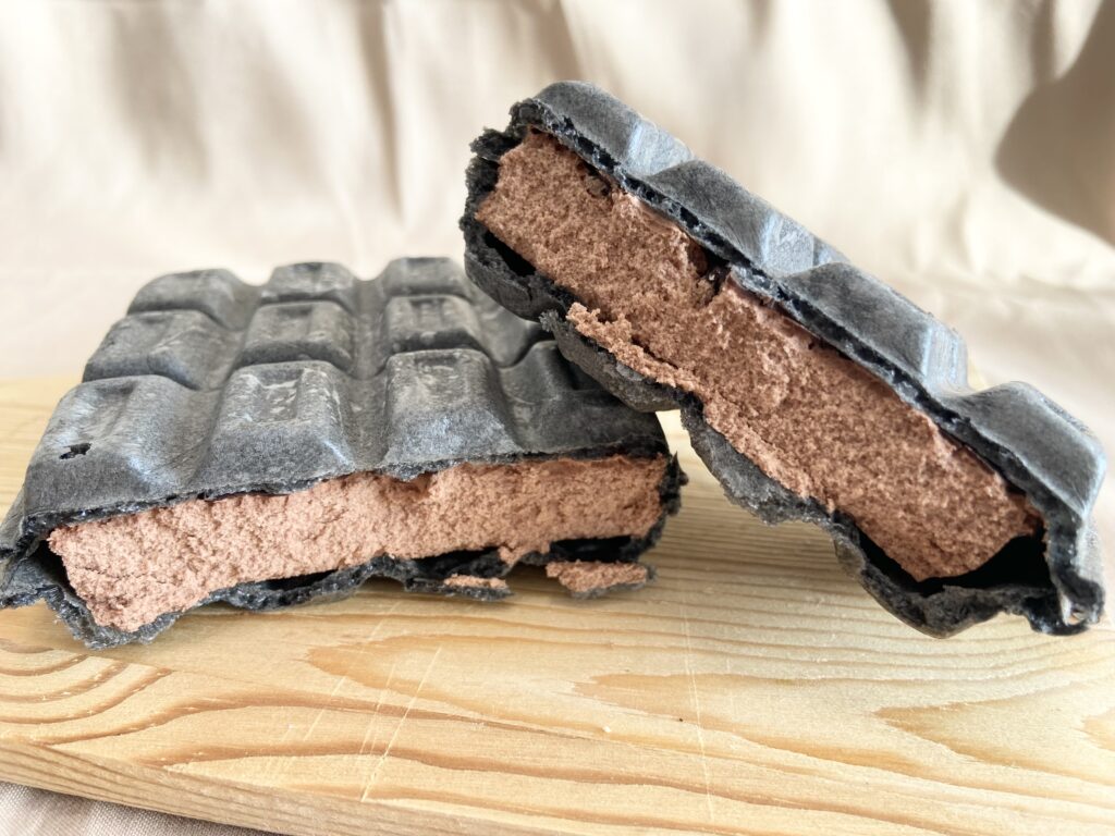 2種類のクッキーをチョコに混ぜ込みブラックサンダーのザクザク感を再現。アイスにはカカオマスとココアパウダーを配合しているので、チョコ感をしっかり味わえます。