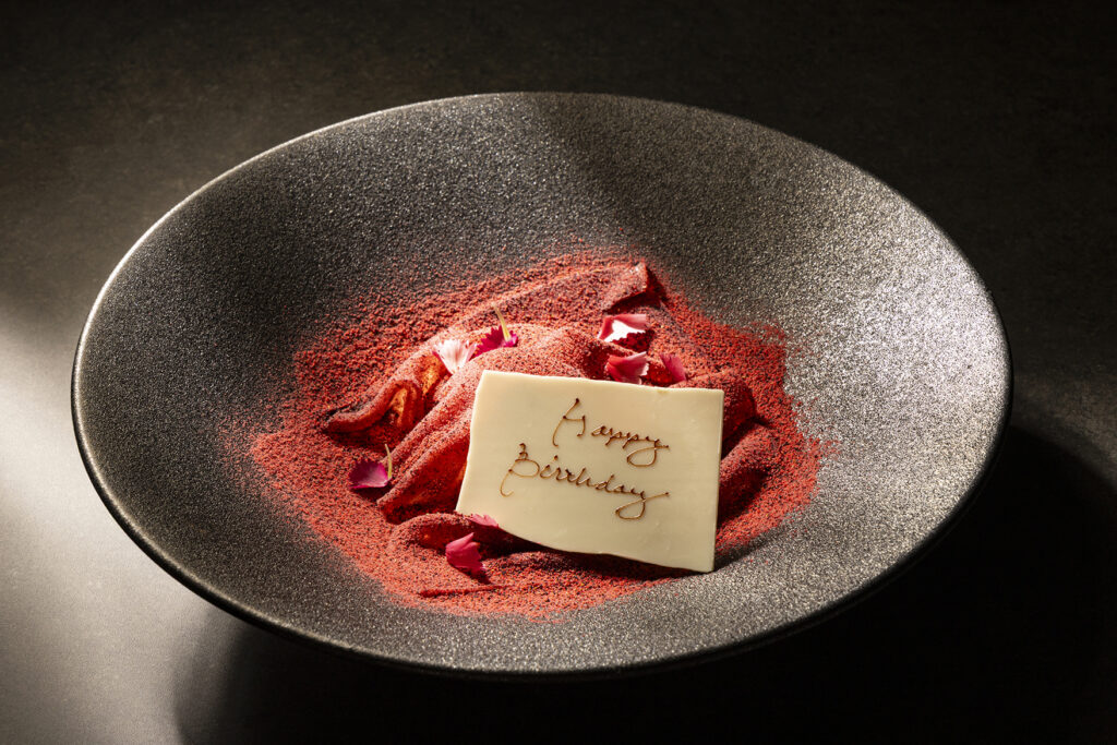 苺とゆずのジェラート、濃厚なマスカルポーネムースを、ハイビスカスがほのかに香るジュレで包み込んだ華やかなデザートには、希望に応じてメッセージプレートを用意してくれるサービスも。大切な人をお祝いする記念日ディナーにぴったりです♡
