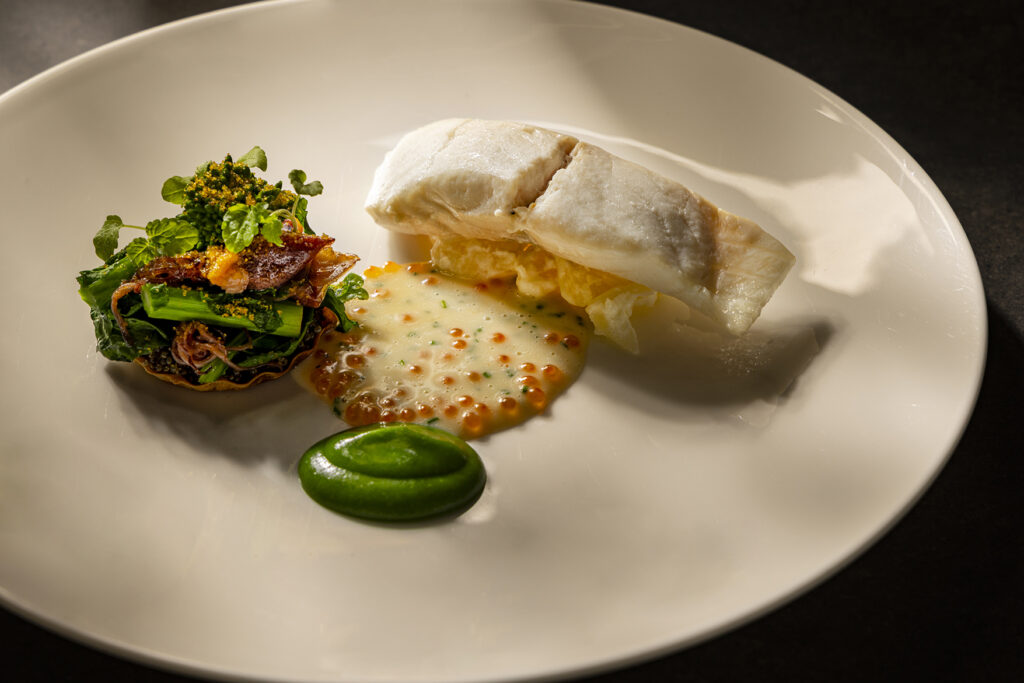 メニューの一部「桜鯛のヴァプール」は、旬の桜鯛をふっくらと蒸し上げ、新じゃがのサワーポテトとともに軽やかに仕立てられています。ホタルイカと菜の花のほろ苦いアクセントに、とんぶりのプチっとした食感や、ふき味噌のコクを重ね、春の味覚を多彩に表現。野菜の旨みを凝縮したブイヨン・ド・レギュームが、全体をやさしくまとめ上げた贅沢な一品です。