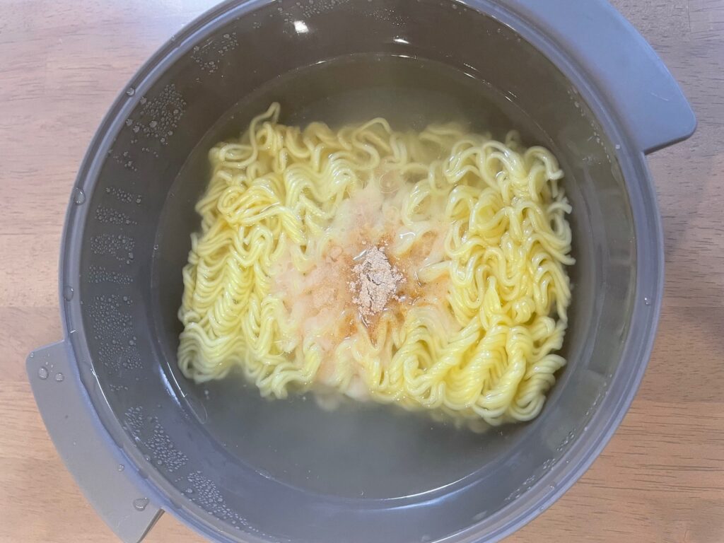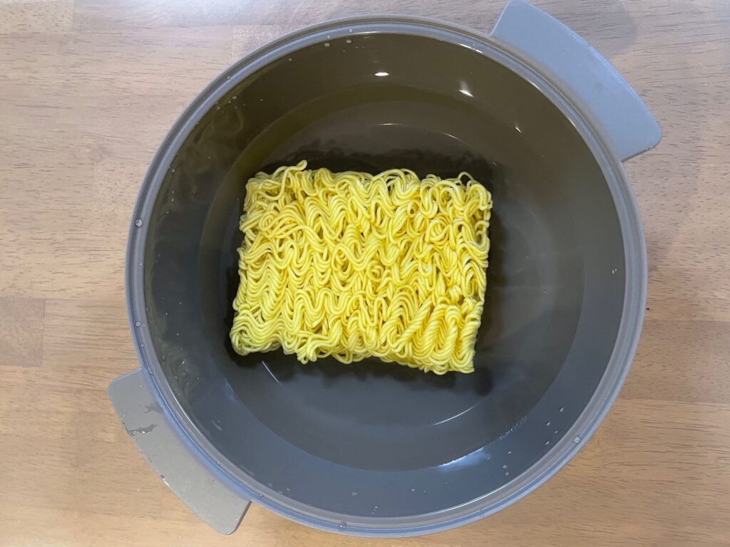 麺と、袋麺のパッケージに書いてある容量の水(またはお湯)を本体に入れます。