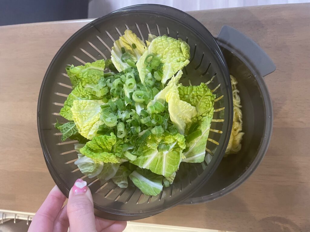 3COINSの「《レンジで簡単》ザル付きビストロヌードル/KITINTO」は、電子レンジだけで袋麺が作れるうえ、野菜も同時に調理できる超優秀キッチンアイテム。火を使わないから忙しい日や疲れている日でもラクに使えて、洗い物が少ないのもうれしいポイントです。
