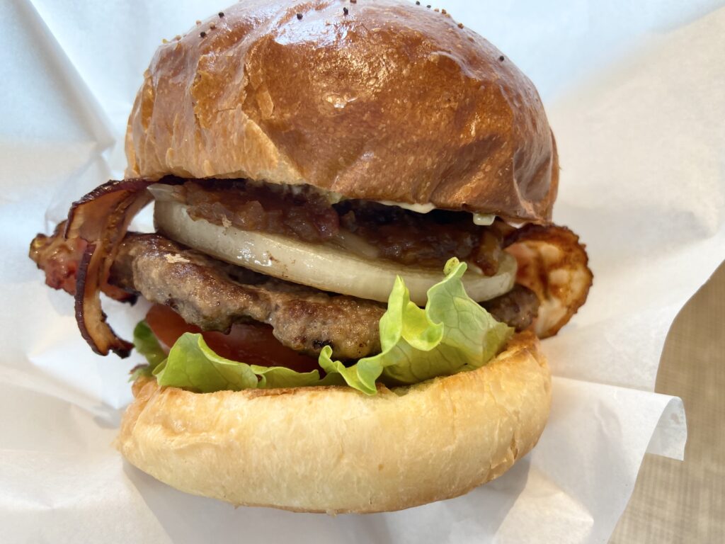 パティの上にはグリルオニオン、焼きベーコン、オニオンスライスもトッピングされています。パティは肉汁があふれてくるほどジューシー。野菜も新鮮でシャキシャキ!どの食材も最高の状態です。