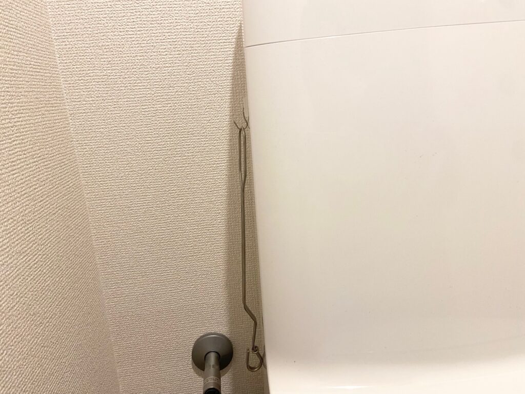 トイレ本体にフックをつけて、掛ける収納をしています。コンパクトに収納できるだけでなく、床に直置きしていないからお掃除もラクになります。