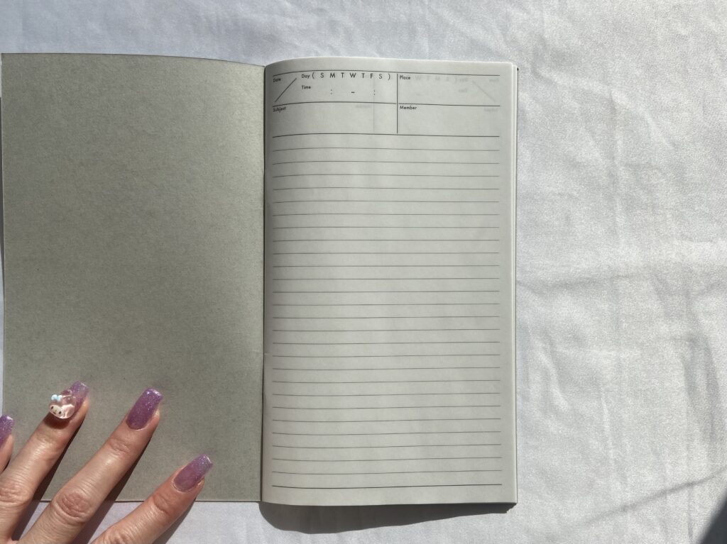 中を開くと、日付、仕事、メンバーなどを記入する欄が少しあり、あとはフリーに使えるメモ帳が用意されているノートです。日記のように使うもよし、タスク管理するために使うもよし、ネタ帳にするもよし…。自分の好きなように使えるので、ジャーナリングノートをタイプ別に分けている上級者にもおすすめです。