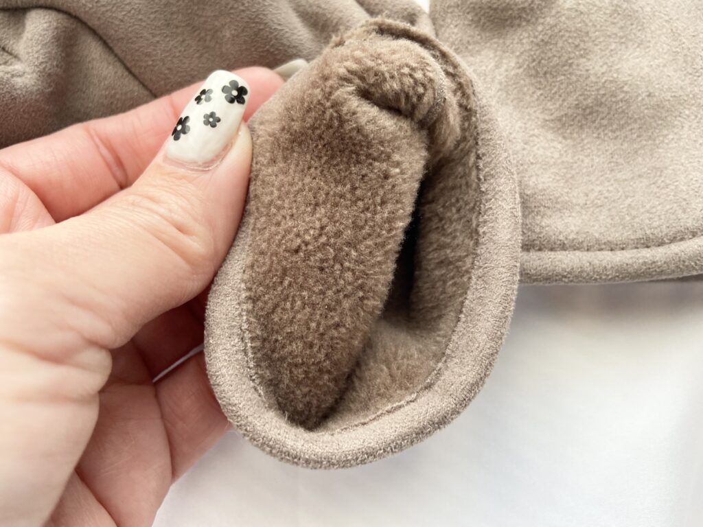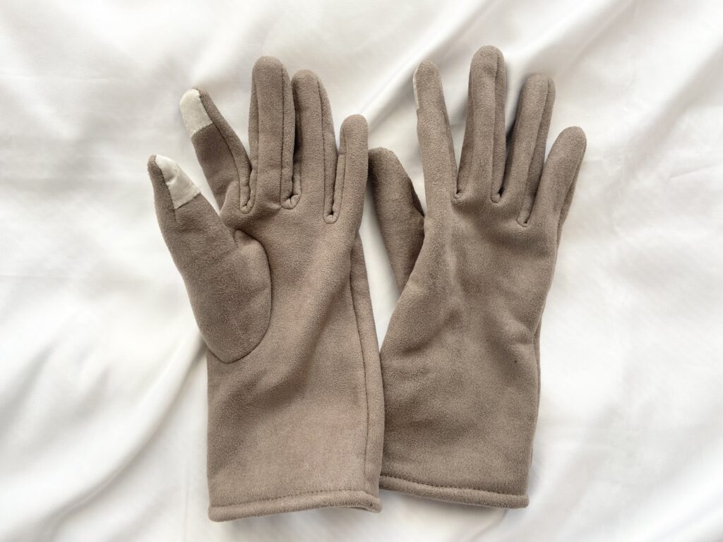 スエード調の生地が上品な印象を与えてくれる「スエード調スマホ対応手袋」(330円・税込)は、人差し指と親指はスマホ対応なので着脱しなくてもスマホ操作が可能。コーディネートを選ばない合わせやすいベーシックなデザインが高見え。