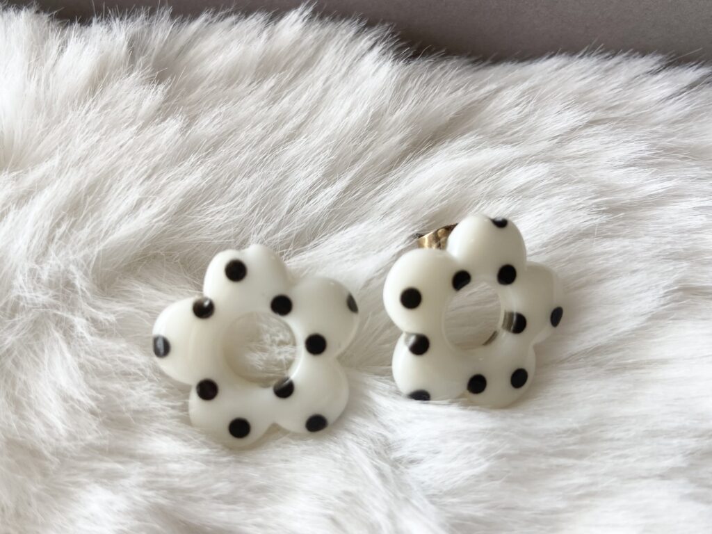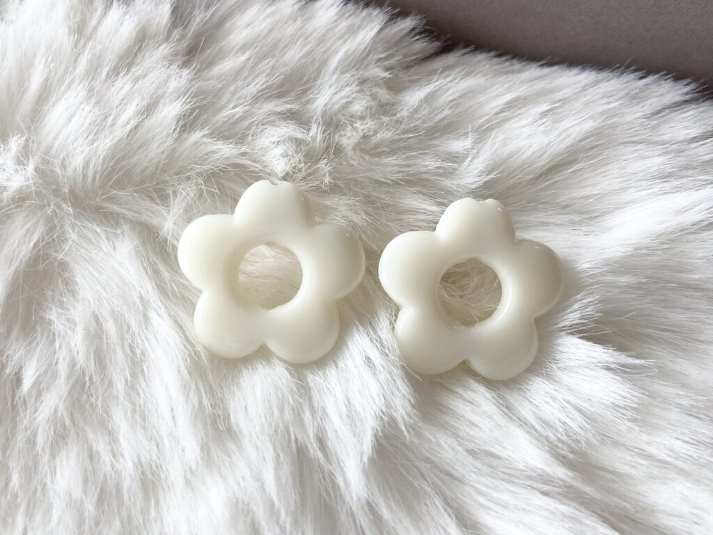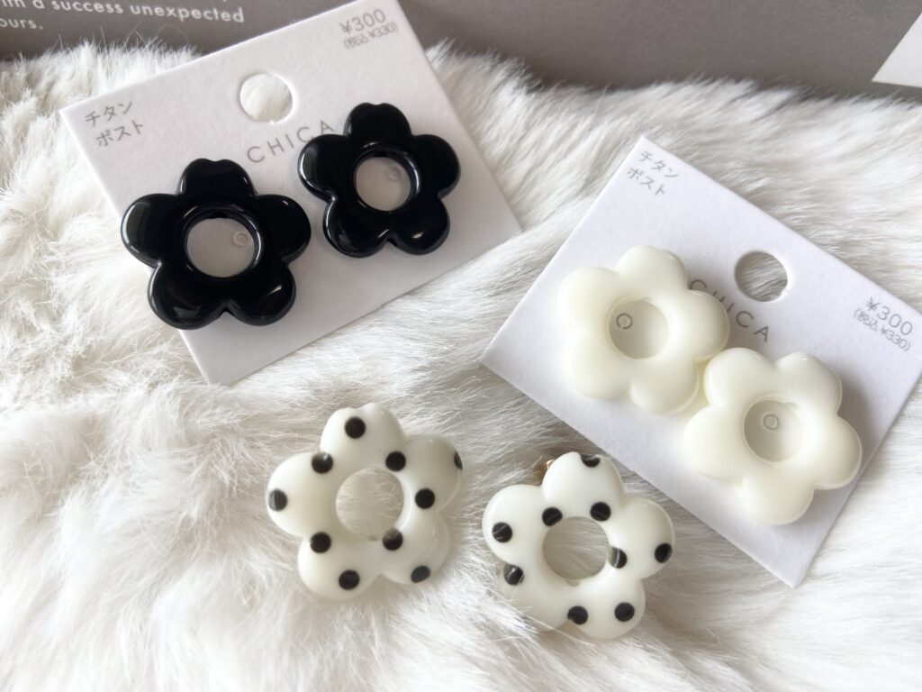 「モノクロフラワーピアス」(各330円・税込)は、2026年2月に発売したばかりの新作ピアス。同じデザインのイヤリングも展開しています。思わず全色購入してしまったお気に入りのピアス。同じデザインでも、カラーが違うだけで印象がガラリと変わります。