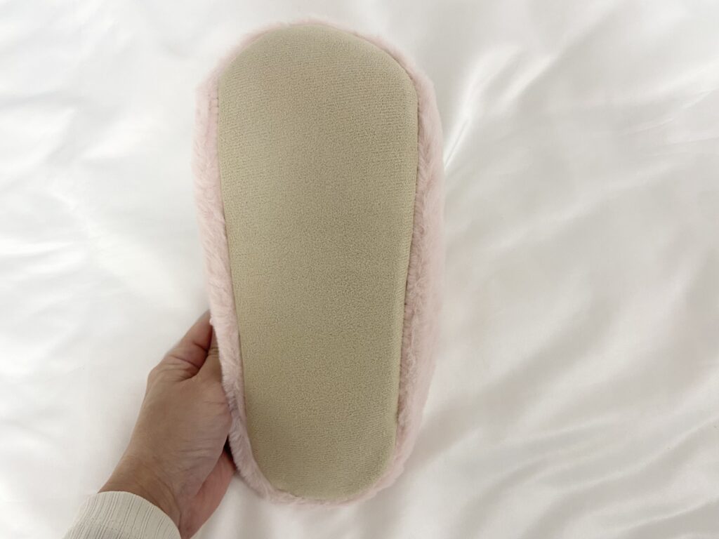 スリッパのサイズは約23cm~25cm。女性向けのサイズ感です。足先が閉じているデザインなので、寒い季節もぽかぽか♡スリッパには滑り止めは付いていないので、ぬれた床面など滑りやすいところでの使用は、スリップ・転倒の原因になることもあるため要注意。普通に部屋で履いていれば特に問題ありません。
