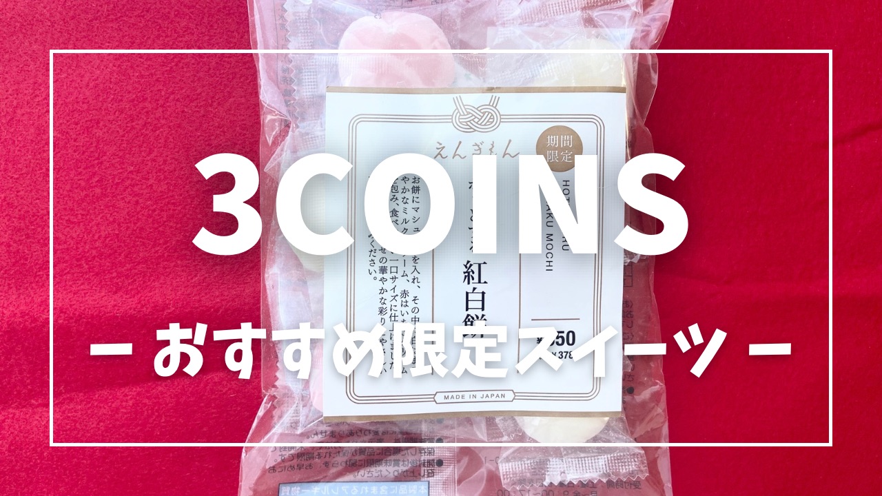 毎週3COINS(スリーコインズ)をパトロールするのがルーティン!3COINS歴20年以上のマニアの私が3COINSに立ち寄ると必ずチェックしてしまうのが食品コーナー。今回は、マニアのおすすめスイーツ、期間限定販売「えんぎもん ホッとする 紅白餅」をご紹介します♪