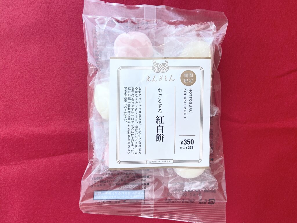 3COINSのプライベートブランド「おかしもん」の人気スイーツ「ホッとするお餅」シリーズから期間限定販売中の「えんぎもん ホッとする 紅白餅」(378円・税込)。お正月シーズン限定の商品で、いましか手に入らないレアスイーツ!オンラインサイトでは販売しておらず、食品を取り扱う3COINSの実店舗のみ購入可能です。