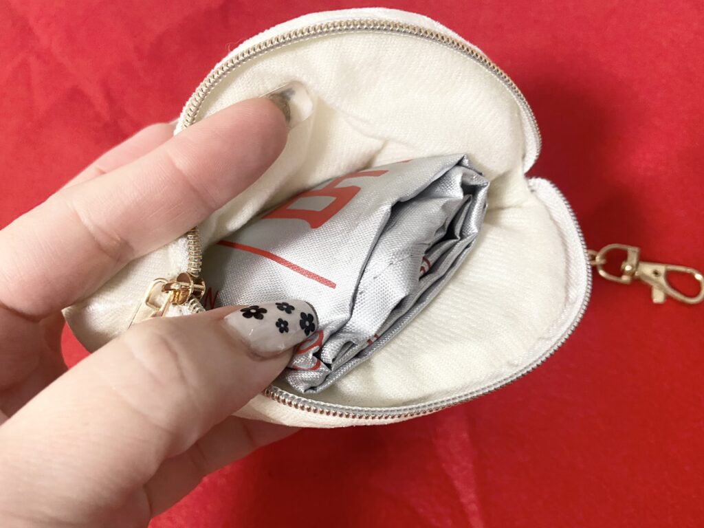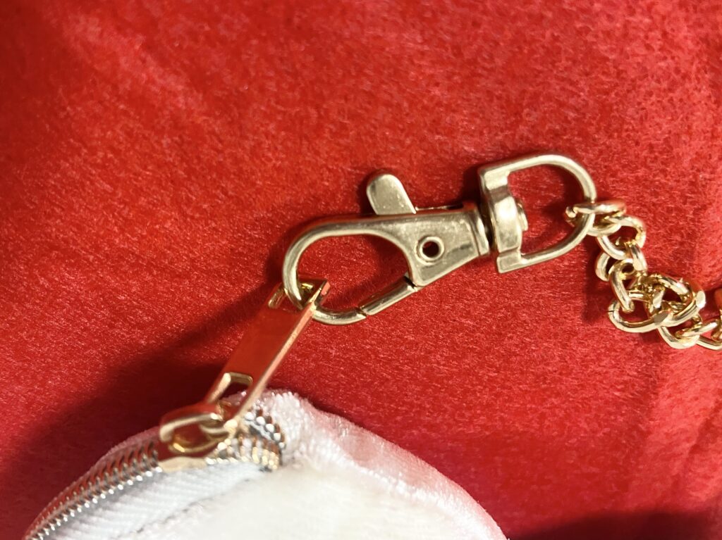 「チェーン付きベロアハートポーチ」は、定価550円の、バッグチャームにもなるポーチ。2026年1月24日現在、なんと70%オフの165円で販売されています。カラーは、アイボリー、レッド、ブラックの全3色。私が購入した店舗ではアイボリーのみ在庫がありました。ちなみに、オンラインサイトでは完売中。
