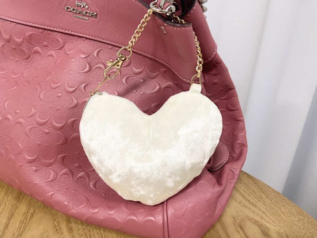 フワフワとしたハートの形のポーチは持っているだけでテンションが上がる可愛らしさ♡リップや目薬など細々したものを収納するのにちょうどよいサイズ感です。私は、収納ポーチを落としてしまったエコバッグの2代目収納ポーチとして愛用中!