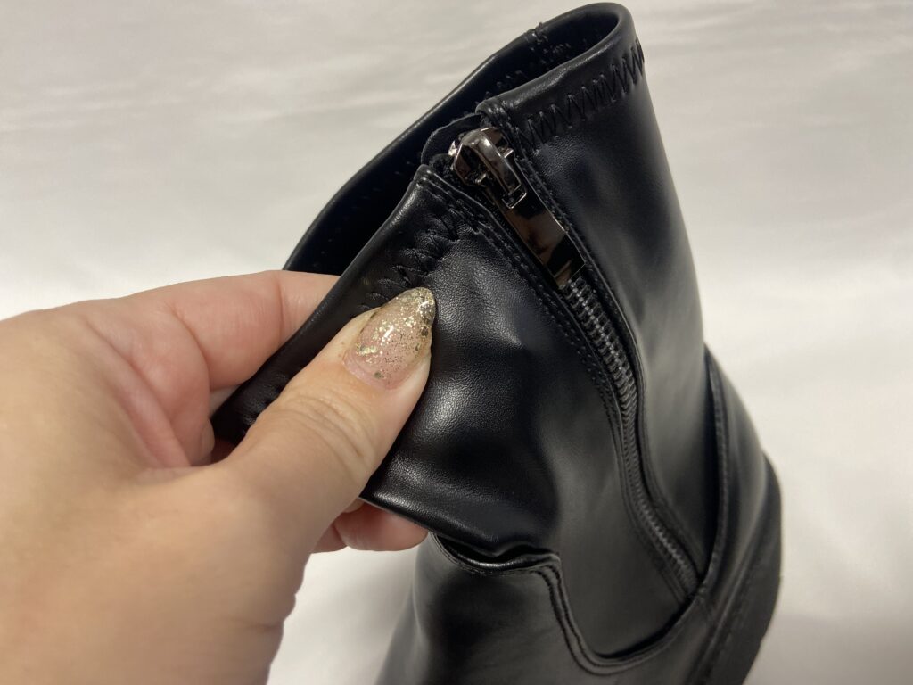 フェイクレザーですが、安っぽさを感じず高見えなのも選んだ理由のひとつ。生地は柔らかくて履いていて痛くなったり擦れたりは今のところありません。とにかく、履き心地がお値段以上!