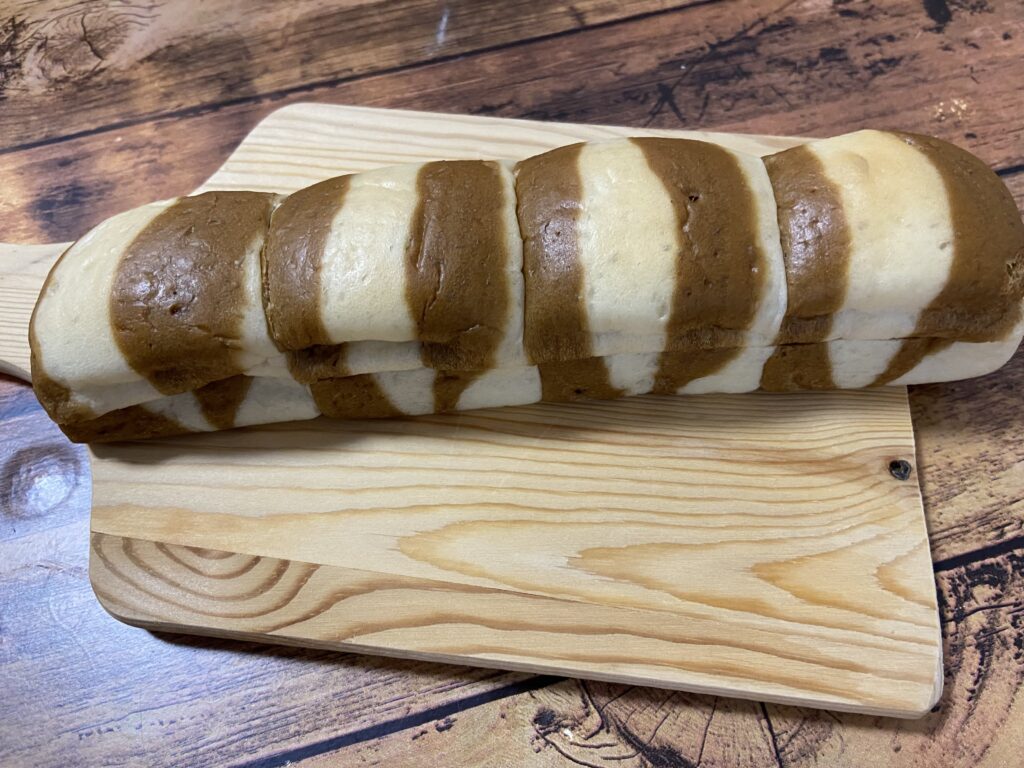 「しっぽみたいなキャラメルクリームサンド」(178円・税込)は、ミルク風味の生地とキャラメル風味の生地でしま模様のしっぽに見立てたちぎって食べやすいパン。