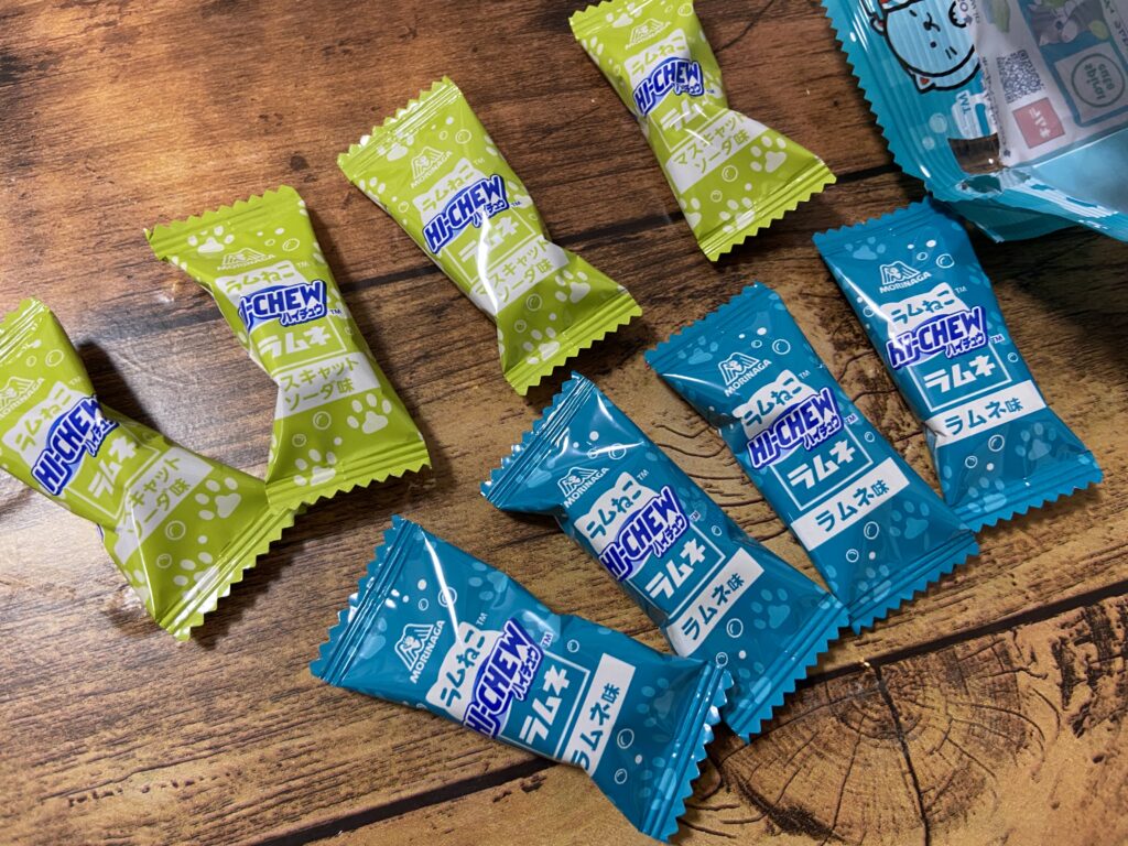 ハイチュウは「ラムネ味」と「マスキャットソーダ味」の2種類が、それぞれ4個ずつ入っています。