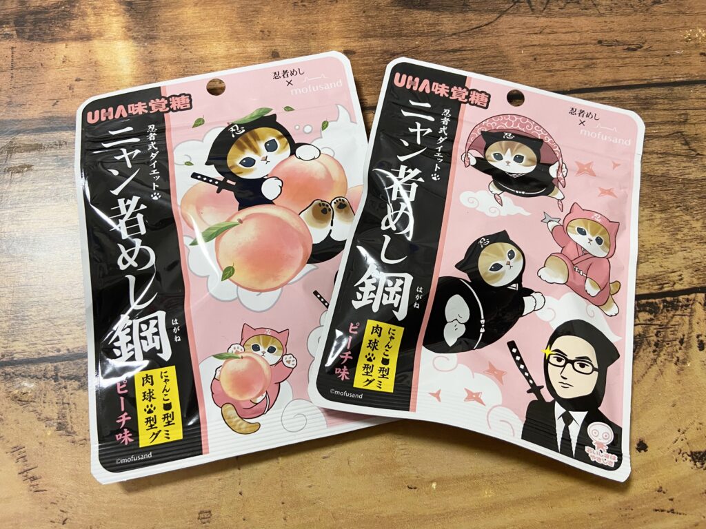 「ニャン者めし鋼 ピーチ味」(183円・税込)は、「mofusand」×忍アソートのピーチ味のグミで、パッケージのデザインは全2種類。