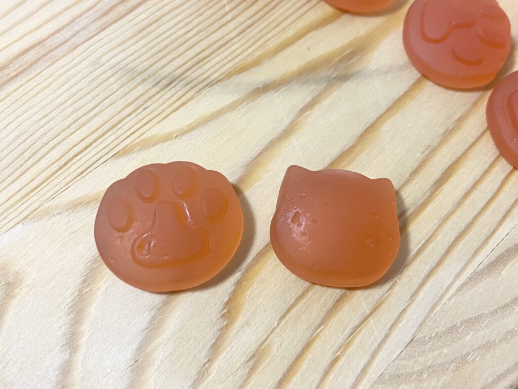 噛み応えのあるグミはにゃんこ型と肉球型の2種類です。