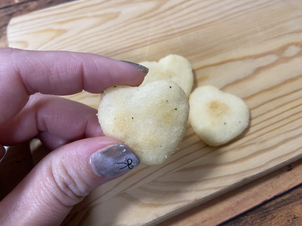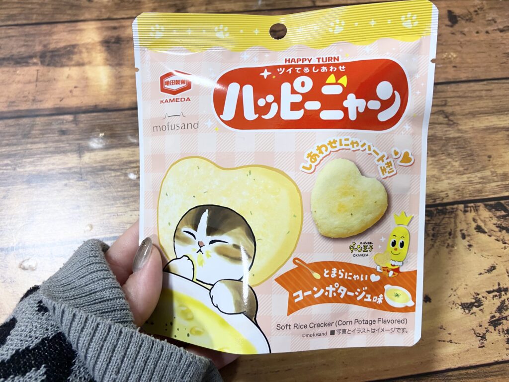 ハート型のハッピーターンはコーンポタージュ味。食べだすと止まらないおいしさです。