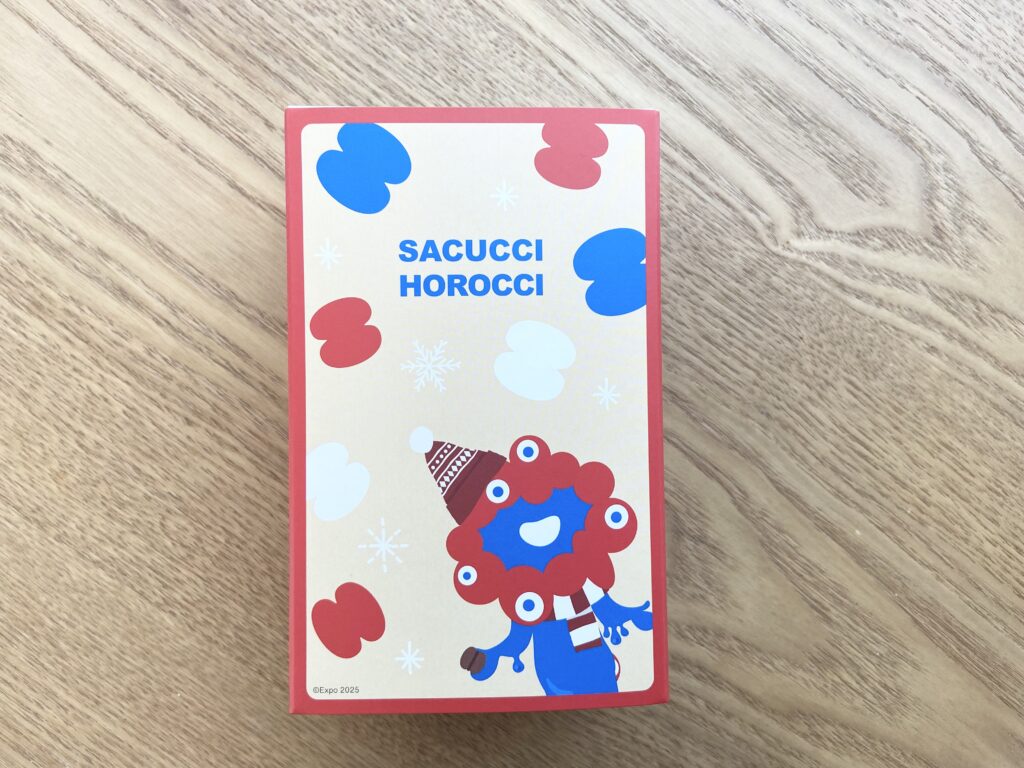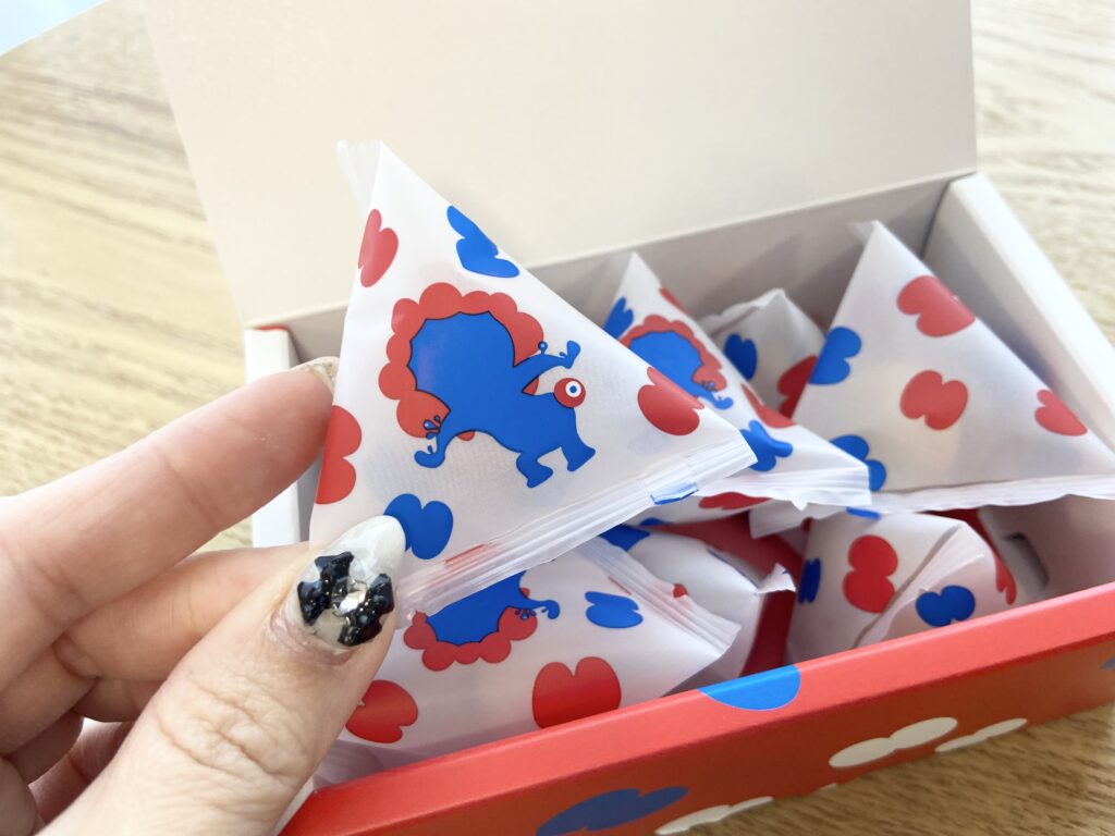 どちらのパッケージも中身の個包装のデザインは同じ。ミャクミャクの後ろ姿が描かれた三角形のデザインの個包装の中に「サクッチ・ホロッチ」が入っています。食べたいときに食べたい分だけ食べられるのはうれしい♪