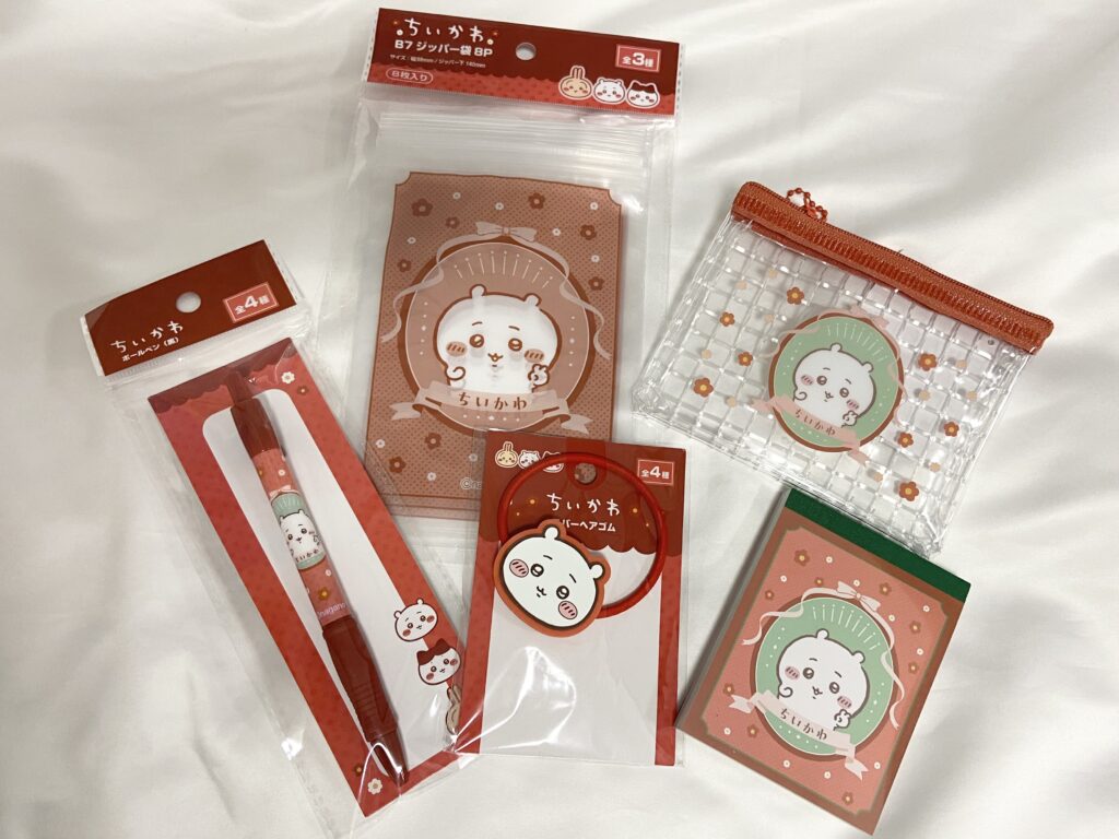 2026年3月に発売した「ちいかわ×100均」シリーズ第8弾。今回のラインナップは、「ラバーヘアゴム」、「ボールペン」、「ミニメモ帳」、「ミニメッシュポーチ」、「B7ジッパー袋8P」。どの商品も日常使いしやすいアイテムばかりでお値段全品110円(税込)!