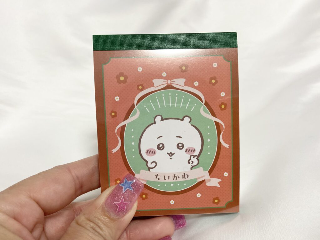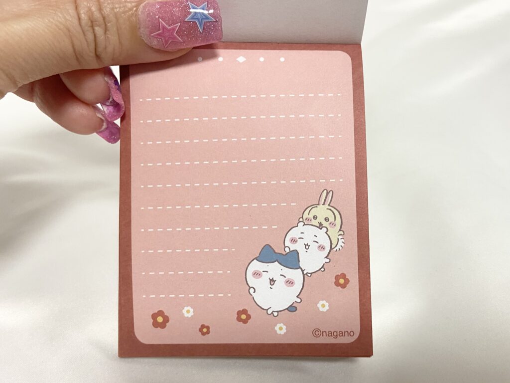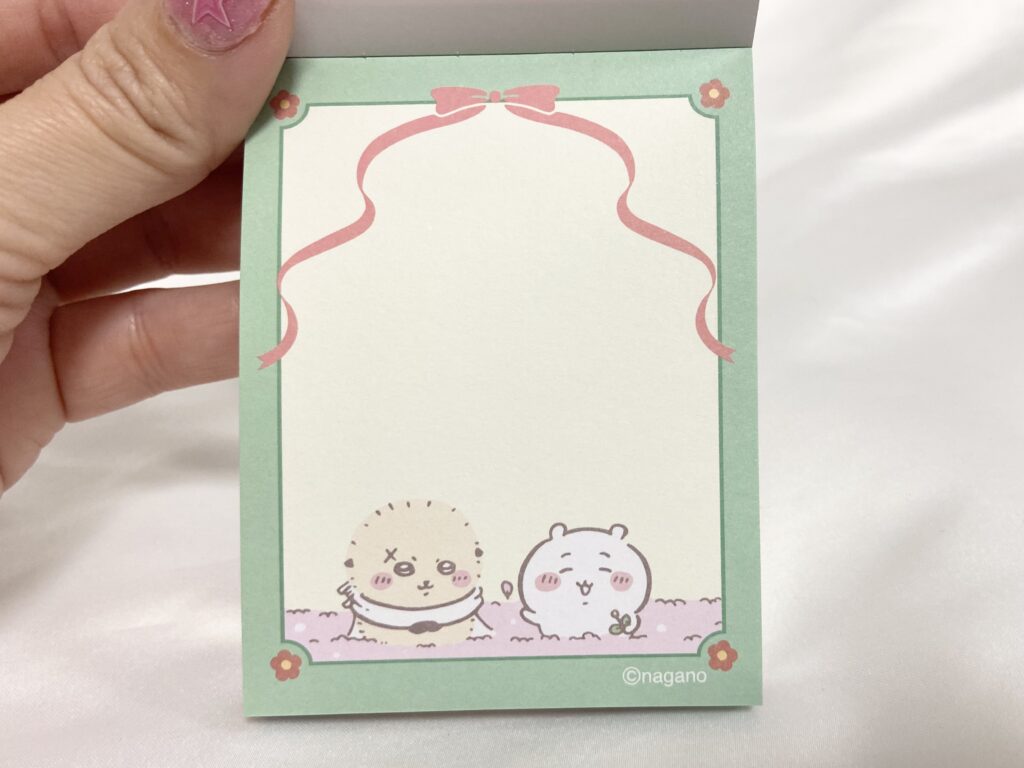 メモ帳は、それぞれ2デザイン。ちいかわは、ラッコ先生とちいかわがお花畑で過ごしているデザインと、ちいかわ・ハチワレ・うさぎの3人が笑顔で並んで歩いているデザインのメモ帳です。これは全種類買えばよかった…とちょっと後悔。
