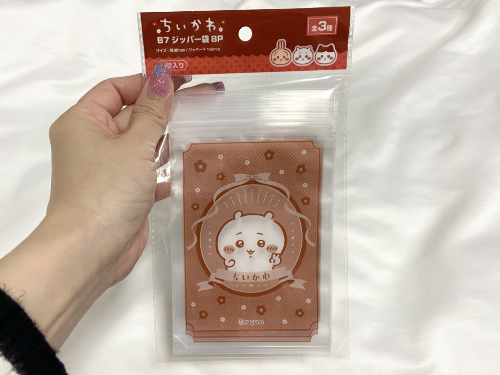 「ちいかわ B7ジッパー袋8P」(110円/税込)は、ちいかわ、ハチワレ、うさぎの全3種類。何かと使えるB7ジッパー袋。私はばんそうこうを入れて持ち歩いたり、子どもにお小遣いを渡す時用の袋(使いまわし)にしたりしています。