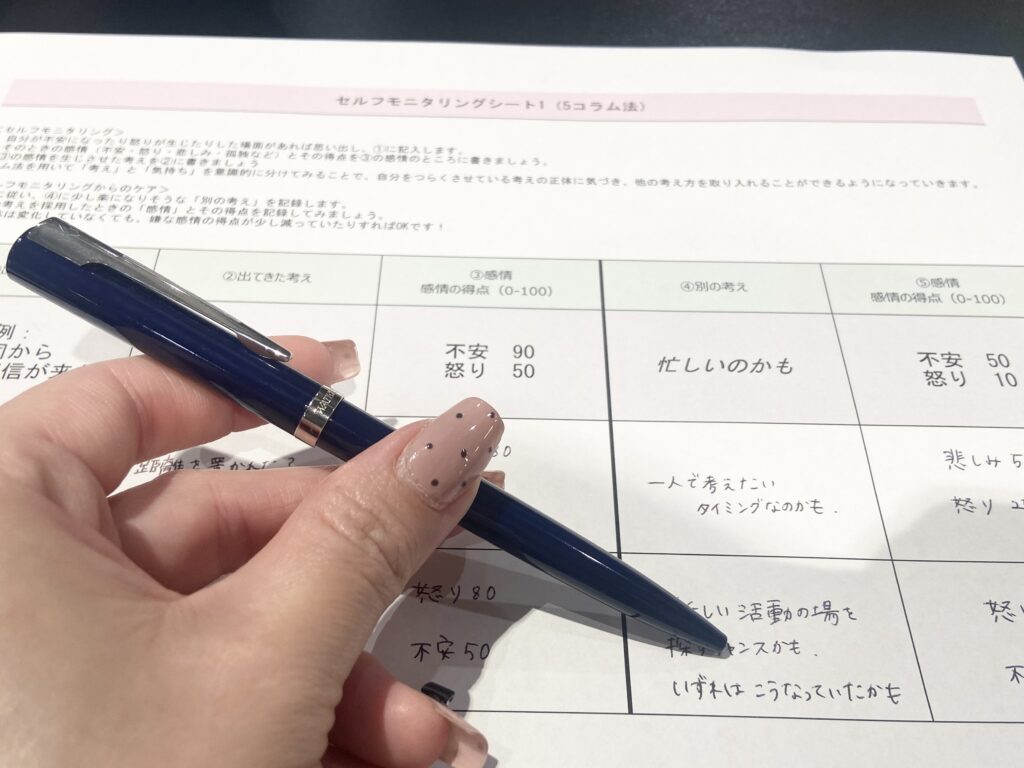 体験したセルフモニタリングは、出来事を「出来事の状況」「出てきた考え」「感情(感情の得点)」「別の考え」「感情(感情の得点)」に分けて整理する「5コラム法」というセルフモニタリング法。