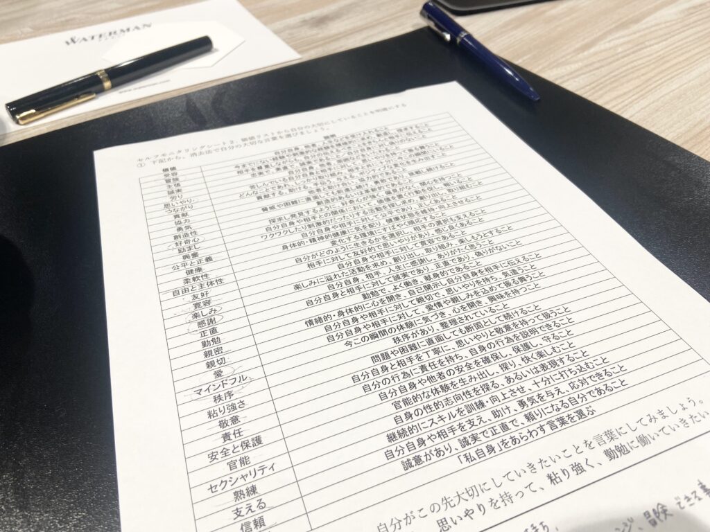 私は、「冒険」「思いやり」「好奇心」「楽しみ」「感謝」の5つのワードが残ったので、『人に対して思いやりと友好的な精神を持ち、常に新しいことを見つける好奇心を忘れず、毎日チャレンジ冒険できることに感謝し、楽しく過ごしたい』という言葉を作りました。少し強引ですが、自分自身が持っている考えや目標にマッチしていて隠せないな…と実感しました。