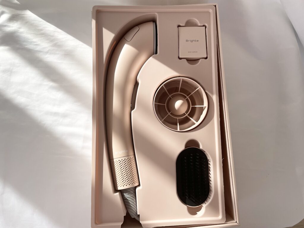 Brighte「SHOWER DRYER」は、ナノミスト・デュアルイオン・LEDテクノロジーを搭載した、まさに次世代型の美容ドライヤー。大風量で素早く乾かしながら、髪と頭皮を同時にケアできるのが魅力です。
